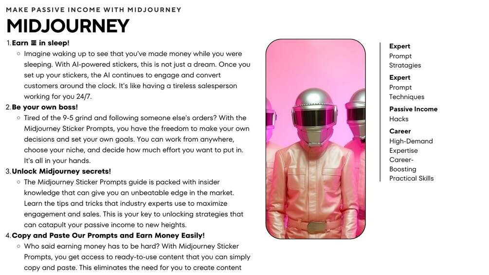 - Unlock the secrets of passive income with AI and Midjourney Sticker Prompts. Master the art of engagement and conversion through AI, break free from traditional methods, and embark on a journey to financial success. Ideal for e-commerce enthusiasts, social media influencers, and local business owners.